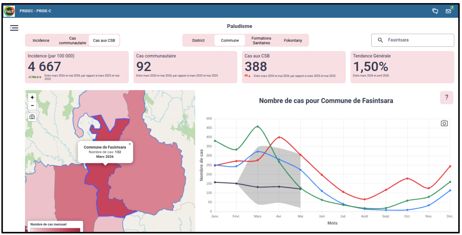 The PRIDE-C DHIS2 Application is a Javascript dashboard application that can be installed into DHIS2 instances. It is specifically configured to work with PRIDE-C forecasts of malaria, diarrhea disease, and acute respiratory infections among children under 5 years old. It provides a user-friendly front-end for accessing disease forecasts and climate variables through maps, time series graphs, and data tables. It is currently available in French.